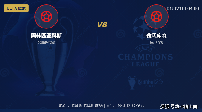 北京时间1月21日凌晨04:00,欧冠联赛将迎来一场关键对决。希腊豪门奥林匹亚科斯将坐镇著名的卡莱斯卡基斯球场,迎战远道而来的德甲劲旅勒沃库森。