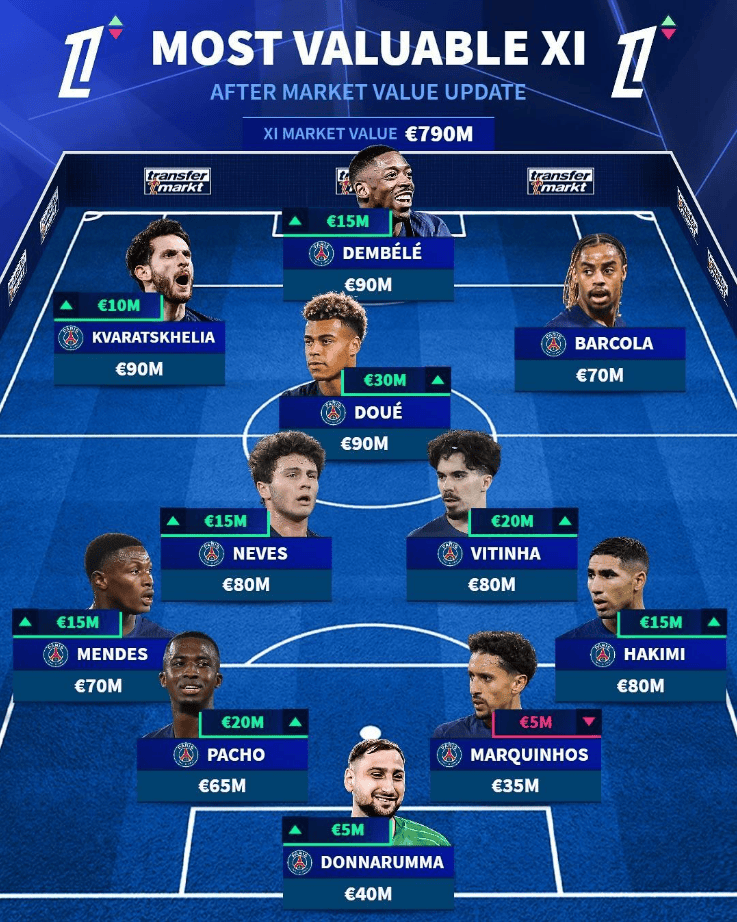 更新完成后,法甲身价排名最贵的11人阵容全部来自大巴黎,其中登贝莱、克瓦拉茨赫利亚和杜埃以9000万欧的身价领跑整个法甲。
